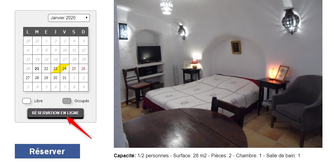 Dans le menu "Nos hébergements", cliquez dans le sous menu sur le gîte qui vous convient en fonction de sa capacité > sélectionner un gîte adapté > lire le descriptif > regarder le calendrier avec ses disponibilités > cliquer sur Réservation en ligne > Sélectionner le nombre de personnes > remplisser vos coordonnées et cocher la case pour accepter la politque d'annulation (bien lire avant)> Payer de façon sécurisée avec votre carte de crédit > Recevez votre confirmation de réservation par Email via notre Logiciel Avaibook. (Si vous n'avez pas reçu votre confirmation de réservation, c'est qu'elle a échouée dans vos spams, bien vérifier ceux-ci!).